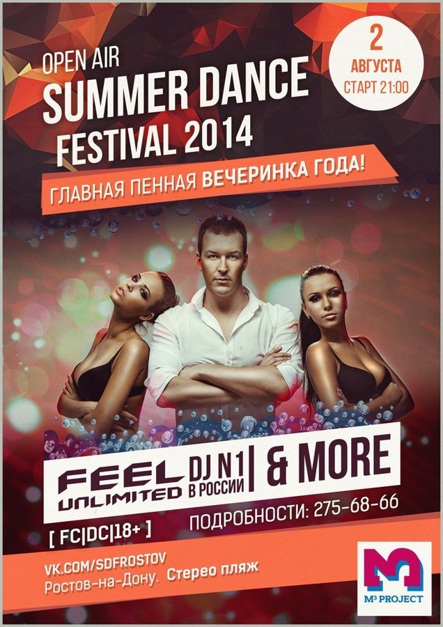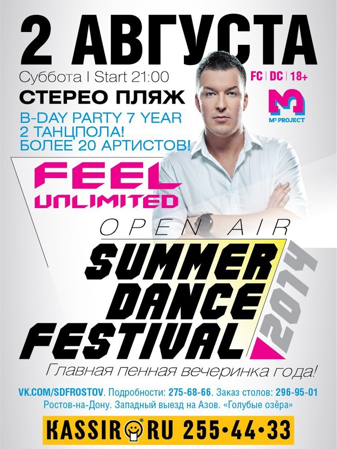 Pr&event group «M³ PROJECT» представляет: "SUMMER DANCE FESTIVAL 2014!"! 2 августа! Суббота! Легендарный "Стерео пляж" отметит свое День Рождение самой глобальной пенной вечеринкой этого лета!!! Специальный гость: Dj FEEL - Dj №1 в России! 2 ТАНЦПОЛА! БОЛЕЕ 20 АРТИСТОВ! КИЛОВАТТЫ ЗВУКА И СВЕТА! ТОННЫ ПЕНЫ! А так же: *Светодиодное шоу *Шоу на барной стойке *Go-Go ladys *WELCOME-DRINKS И многое другое!!!