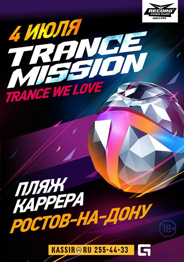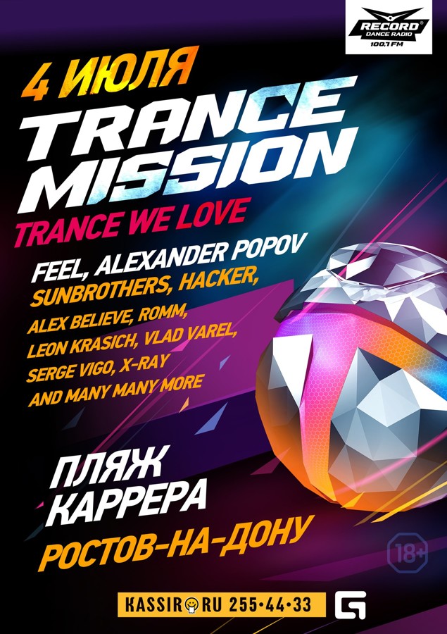 Нет ничего более прекрасного, чем эта музыка! Она объединяет нас. Дарит на новые вселенные и возможность мечтать. Сама искренность заложена в этих мелодиях и мы верны ей! Долгожданное возвращение любимого транс-фестиваля в Ростов-на-Дону! Радио Рекорд в Ростове представляет! Фестиваль Трансмиссия! 4-е июля! Ростов! Пляж Карерра. 22 00 Трансмисcия. Имена 10 героев ТрансМиссии во главе с Dj Feel’ом вы узнаете совсем скоро! Билеты уже сейчас на сайте kassir.ru, в кассах города и по телефону 255-44-33 Первые 100 билетов класса Standart - 500р Следующие 200 билетов - 700р Последующие билеты - 900р В день мероприятия значительно дороже, если останутся в продаже. Билеты класса VIP. Болконный сектор с возможной посадкой: Первые 50 билетов - 900р Следующие 50 билетов - 1100р В день мероприятия значительно дороже, если останутся в продаже. Категория 18+