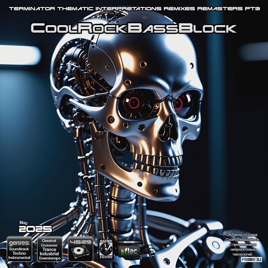 [1] Третья по счёту часть тематических интерпретаций, ремиксов и ремастеров из вселенной The Terminator. Более того, здесь есть и конкурсный треки. Конкурс проходил здесь, на PromoDJ, его организатором выступил Mark Punk. И его трек в эту часть микса был тоже включен! [2] Так как есть исходный материал в формате FLAC и для тех, кому необходимы ровные пики используется FLAC контейнер 24 bit 44.1KHz. При этом сайт самостоятельно конвертирует этот микс в mp3 и для всех желающих сразу доступна его mp3 версия. [3] Но есть одно но: предлагаю особенно незарегистрированным пользователям PromoDJ скачать этот микс именно в формате FLAC, по той причине что tracklist размещён в разделе Комментарий внутри самого FLAC файла и при автоматической конвертации в mp3 он скорее всего перенесён автоматически не будет! [4] Микс прошёл Mastering и звучит вполне ровно. [5] Обложка 555х555 пикселей также добавлена в сам FLAC файл. [6] По содержанию : треки разных жанров, есть и Industrial, Trance, Classical Crossover, DNB. [7] Габариты : вес FLAC файла = 535Mb. [8] Для зарегистрированных слушателей Tracklist доступен сразу с .CUE файлом и указанием BPM, что удобно для тех, кто предпочитает слушать миксы потреково или нарезать отдельные треки. CoolRockBassBlock - Terminator Thematic Interp Remixes Remasters Part3 (Cover) @ CoolRockBassBlock