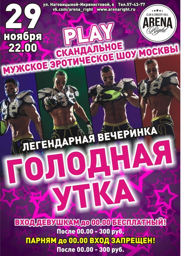 29 ноября, Arena Right - легендарная вечеринка ГОЛОДНАЯ УТКА! Всех дам ждут лучшие представители мужского скандального шоу, а всех мужчин ожидают, очень, много красивых и Голодных уток) Вход девушкам до полуночи - БЕСПЛАТНЫЙ! ПАРНЯМ ДО 00.00 ВХОД ЗАПРЕЩЕН!!!