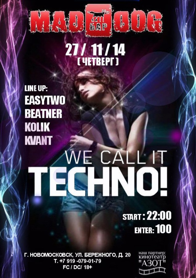 WE CALL IT TECHNO! 27.11.14. (ЧЕТВЕРГ) Line Up: EASYTWO / BEATNER / KOLIK / KVANT Start: 22:00 Enter: 100 р.