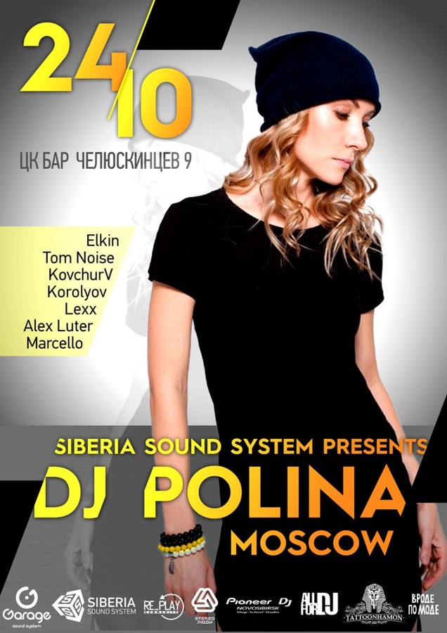 Полина - диджей с неповторимым музыкальным вкусом, успевшая завоевать сердца многих клаберов нашего города. После ее недавнего незабываемого визита, DJ Polina снова в Новосибирске! Siberia Sound System представляет: 24 ОКТЯБРЯ, ПЯТНИЦА. Special guest: DJ POLINA / Moscow / Garage Sound System / LineUp: Ёlkin /Biysk/ KovchurV Tom Noise Korolyov Lexx Alex Luter b2b Marcello Место проведения - ЦК БАР, расположенный по адресу ул. Челюскинцев 9, успевший себя зарекомендовать как уютная, комфортная площадка для подобных мероприятий. Примерная вместимость - 400 человек. Достаточное кол-во столов, второй ярус, балкон, 2 бара. Внимание, столы депозитные и бронируются заранее (6-8 чел). _______________________________________ DJ POLINA играет в клубах с конца 90-х годов. Отдает предпочтение таким стилям музыки как deep, tech-house и techno. Входит в число самых известных и признанных российских девушек – ди-джеев. Уникальный, фирменный sound Полины представляющий актуальные тенденции на клубной сцене, - это сочетание легкости и красоты исполнения сетов. Вечное стремление к совершенству – лишь одна из составляющих ее успеха. Безупречные выступления DJ Полины украшали программы таких фестивалей как «Dance Planet», «КаZантип», «Castle Dance», «Пляж», Loveparade Afterpaty (Berlin), а виртуозные сеты услышали меломаны более 100 городов России, Украины, Белоруссии, Грузии, Азербайджана, Казахстана, Молдавии, Латвии, Литвы, Германии и свидетели глобальных promo туров «Оторвись со всей планетой», «Music Rodeo», «Отмени границы». На протяжении последних лет DJ Polina является соавтором одного из первых радиошоу страны, рассказывающих об электронной сцене. Аудитория этого еженедельного микса составляет несколько миллионов слушателей. _______________________________________ За поддержку благодарим: Re_play Community Stereo Люди AllForDJ Pioneer DJ Nsk Deepology Магазин "Вроде по моде" desperadoph.ru _______________________________________ ВКЛ: 22:00 Вход: 300р. FC/DC