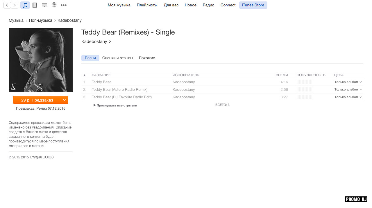 07/12/2015 Official @iTunes! Сегодня в Мировом Музыкальном Сервисе #iTunes Состоялся Релиз Официального Ремикса DJ Favorite на Сингл "Teddy Bear" для группы Kadebostany (Швейцария)!