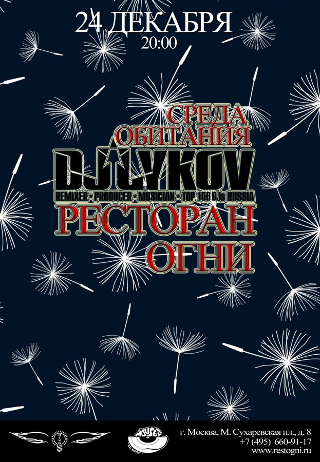 Resident: FASHION MUSIC RECORDS (Moscow), MOUSE-P (Moscow), Курвуазье (Courvoisier), (Moscow), Огни (Moscow), ДАНТЕС (Moscow), Шатер (Moscow), WHITE CAFE (Moscow), Рублевский (Moscow), NIGHT BUS CLUB (Moscow), Chesterfield (Moscow), Stariki бар (Moscow)