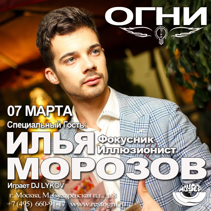 Resident: FASHION MUSIC RECORDS (Moscow), MOUSE-P (Moscow), Курвуазье (Courvoisier), (Moscow), Огни (Moscow), ДАНТЕС (Moscow), Шатер (Moscow), WHITE CAFE (Moscow), Рублевский (Moscow), NIGHT BUS CLUB (Moscow), Chesterfield (Moscow), Stariki бар (Moscow)