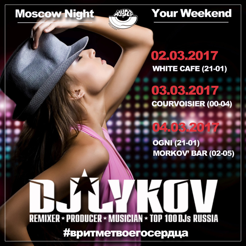 Resident: FASHION MUSIC RECORDS (Moscow), MOUSE-P (Moscow), Курвуазье (Courvoisier), (Moscow), Огни (Moscow), ДАНТЕС (Moscow), Шатер (Moscow), WHITE CAFE (Moscow), Рублевский (Moscow), NIGHT BUS CLUB (Moscow), Chesterfield (Moscow), Stariki бар (Moscow)