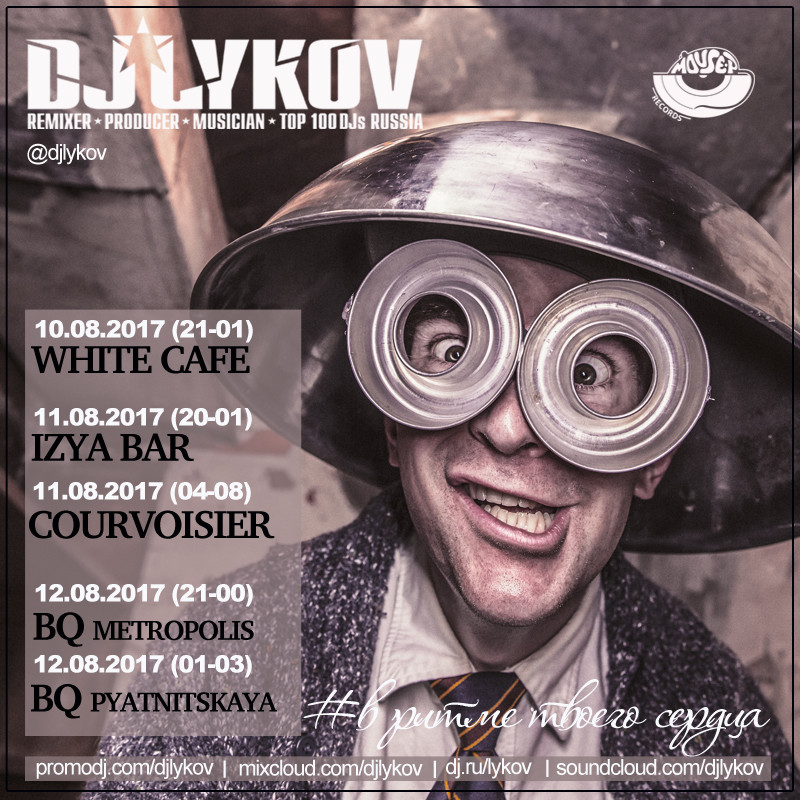 Resident: FASHION MUSIC RECORDS (Moscow), MOUSE-P (Moscow), Курвуазье (Courvoisier), (Moscow), Огни (Moscow), ДАНТЕС (Moscow), Шатер (Moscow), WHITE CAFE (Moscow), Рублевский (Moscow), NIGHT BUS CLUB (Moscow), Chesterfield (Moscow), Stariki бар (Moscow)