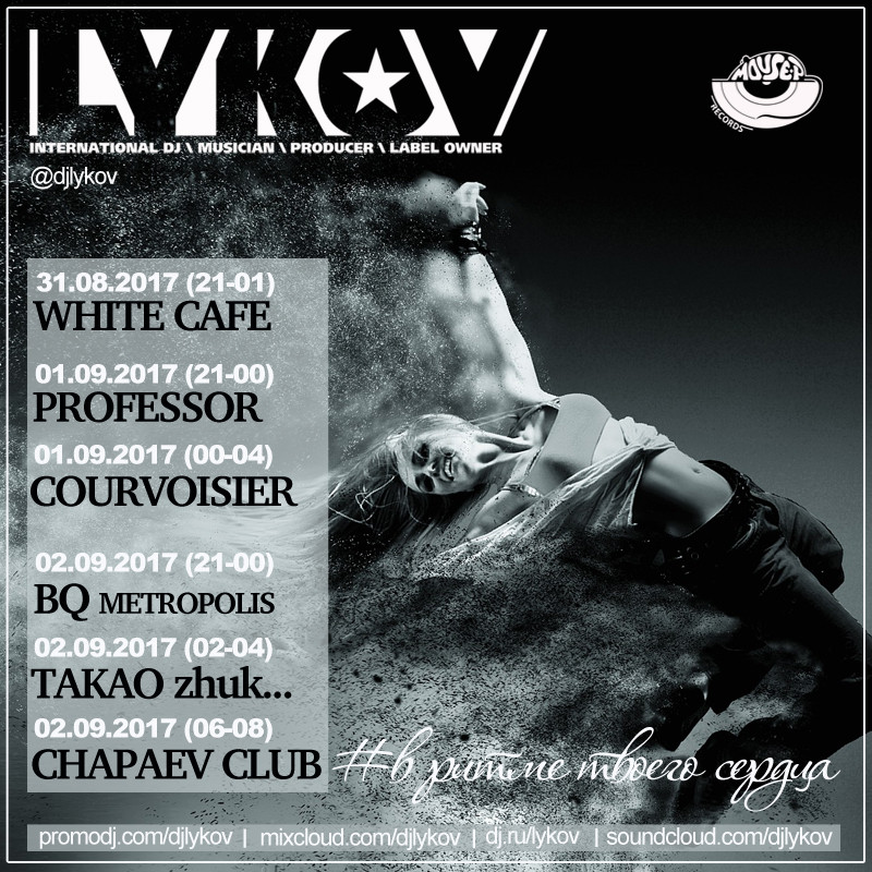 Resident: FASHION MUSIC RECORDS (Moscow), MOUSE-P (Moscow), Курвуазье (Courvoisier), (Moscow), Огни (Moscow), ДАНТЕС (Moscow), Шатер (Moscow), WHITE CAFE (Moscow), Рублевский (Moscow), NIGHT BUS CLUB (Moscow), Chesterfield (Moscow), Stariki бар (Moscow)