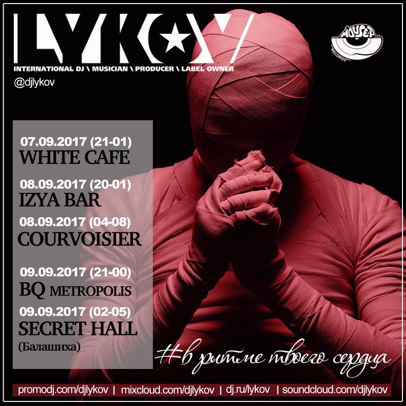 Resident: FASHION MUSIC RECORDS (Moscow), MOUSE-P (Moscow), Курвуазье (Courvoisier), (Moscow), Огни (Moscow), ДАНТЕС (Moscow), Шатер (Moscow), WHITE CAFE (Moscow), Рублевский (Moscow), NIGHT BUS CLUB (Moscow), Chesterfield (Moscow), Stariki бар (Moscow)