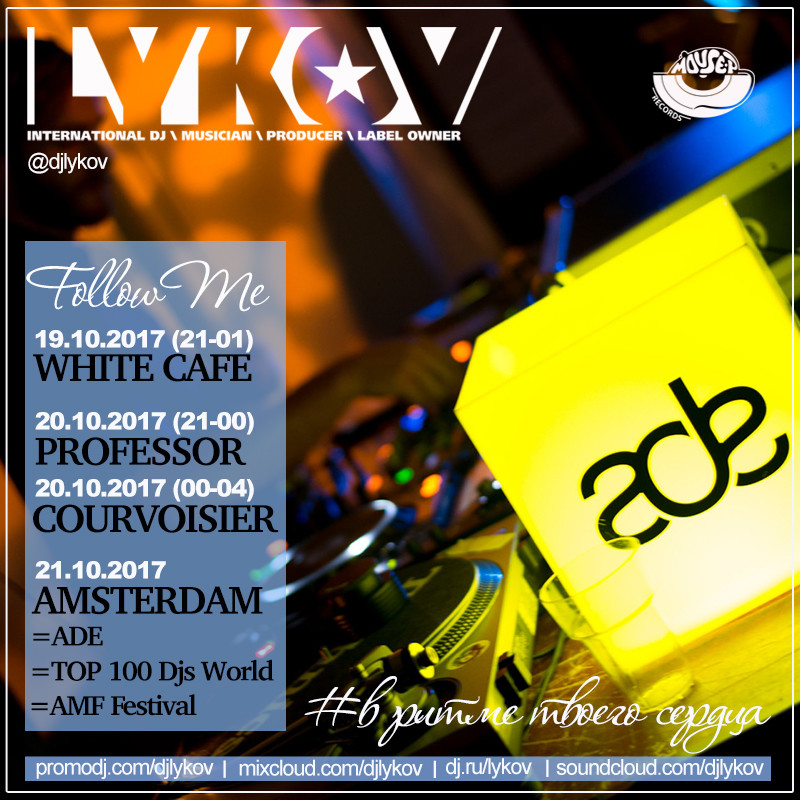 Resident: FASHION MUSIC RECORDS (Moscow), MOUSE-P (Moscow), Курвуазье (Courvoisier), (Moscow), Огни (Moscow), ДАНТЕС (Moscow), Шатер (Moscow), WHITE CAFE (Moscow), Рублевский (Moscow), NIGHT BUS CLUB (Moscow), Chesterfield (Moscow), Stariki бар (Moscow)