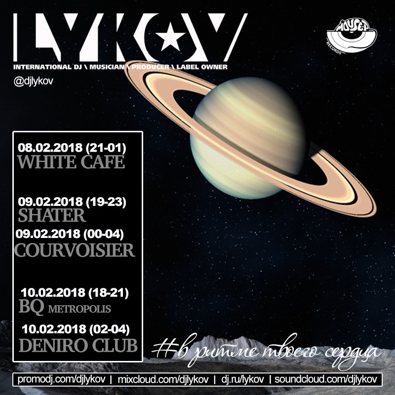 Resident: FASHION MUSIC RECORDS (Moscow), MOUSE-P (Moscow), Курвуазье (Courvoisier), (Moscow), Огни (Moscow), ДАНТЕС (Moscow), Шатер (Moscow), WHITE CAFE (Moscow), Рублевский (Moscow), NIGHT BUS CLUB (Moscow), Chesterfield (Moscow), Stariki бар (Moscow)