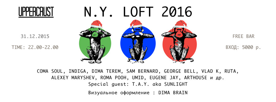 N.Y. LOFT 2К16 Special Guest : T.A.Y. aka SunLight - это новогодний проект, созданный друзьями для друзей и призванный подарить участникам и гостям незабываемый праздник для души, во имя музыки и красоты.
