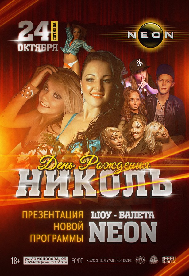 К Дню Рождения хореографа РЦ "NEON" - Николь, презентация новой программы от шоу-балета «NEON». Если вы эстет и ценитель естественной красоты, если вы любите танцы и различные постановочные шоу, если вам нравятся праздники, а также атмосфера веселья и радости, то в эту пятницу мы ждем вас в РЦ «NEON» на презентацию осенней танцевальной программы от шоу-балета “NEON”. 7 абсолютно новых постановочных номеров, световое шоу, максимальный состав танцоров на сцене, дебютные выступления и мастер-классы от профессионалов. Ну и, конечно же, в этот день мы поздравляем хореографа РЦ «NEON» - Николь с Днем Рождения. Цветы и подарки приветствуются! Ждем вас! Всю ночь вы можете насладиться замечательными паровыми коктейлями, удивить близких букетом живых цветов. Не выходя из развлекательного центра, вы можете подарить красивую мягкую игрушку, получить профессиональную фотосессию, выиграть эксклюзивную промо-продукцию и многое другое. Для самых стойких AFTERPARTY в СПК до 09:00 утра. Подробности на сайте: www.534510.ru Условия входа: Единый билет 150 рублей до 23.00. После 23.00: Девушки 300 рублей; Господа — 350 рублей. Бесплатный вход для именинников всю ночь +2 гостя. Скидка на бар и кухню для именинников 15%.