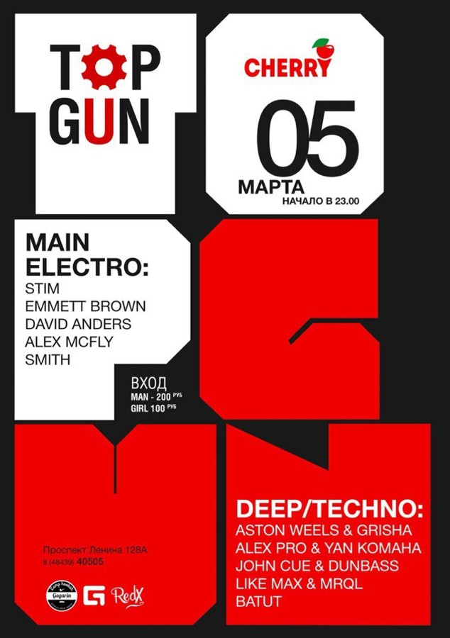 "Воспоминание - это лучшее чем обладает человек! Ведь благодаря им строится вся дальнейшая жизнь!" Дорогие друзья, меломаны! 5 марта TOP GUN приглашаем всех, кто помнит атмосферу НК "ТОПКА" и тех, кто хотел бы посмотреть и услышать музыку именно тех самых времен! Для Вас в эту ночь: Два танцпола. MAIN ELECTRO AREA: STIM EMMETT BROWN DAVID ANDERS & ALEX McFLY SMITH DEEP/TECHNO AREA: ASTON WEELS & GRISHA ALEX PRO & YAN KOMAHA JOHN CUE & DUNBASS LIKE MAX & MRQL BATUT А так же: Бар и кухня от CHERRY CLUB Кальяны от "GAGARIN" Начало в 23:00 ВХОД: муж 200/ жен 100 FC/DC