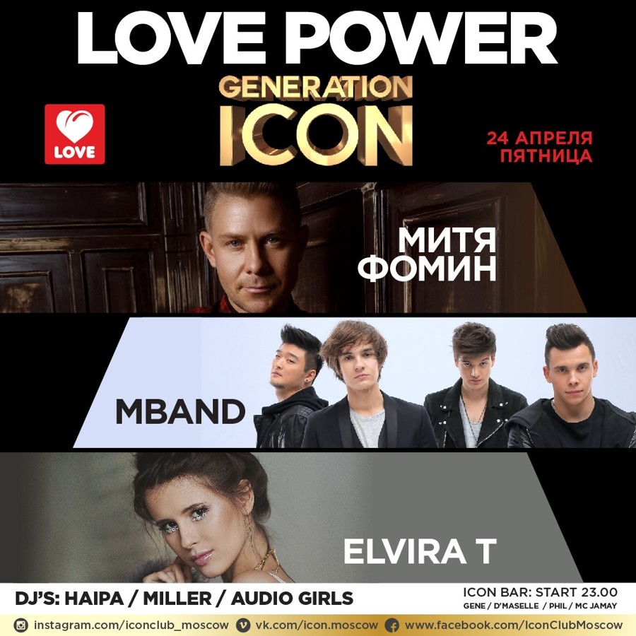 Guest: ICON (Moscow), ICON BAR (Moscow), GIPSY (Moscow), NuBar (ICON / Deep room) (Moscow), RAЙ (Ufa), Icon (Volgograd), Buddha Bar (Moscow), Wow (Moscow), My Moscow Disco (Moscow), Maxim (Moscow), LOOKIN ROOMS (Moscow), ICON Residence (Istra), ZALL  (Moscow), Sky (Sochi), Romanov (Moscow), Батыр (Naberezhnye CHelny), Hype (Kishinev), Maison (Tolyatti), Renaissance (CHeboksary), 16 Тонн (Moscow), ЧЕРДАК (Moscow), Chips (Moscow), HOUDINI (Moscow), Tiffani (Nizhnii Novgorod), The Standard (Moscow), Sanctions (Moscow), Апельсин (YAlta), IDOL (Kazan), Extra Lounge (Serpuhov), Подмосковье (Podolsk)