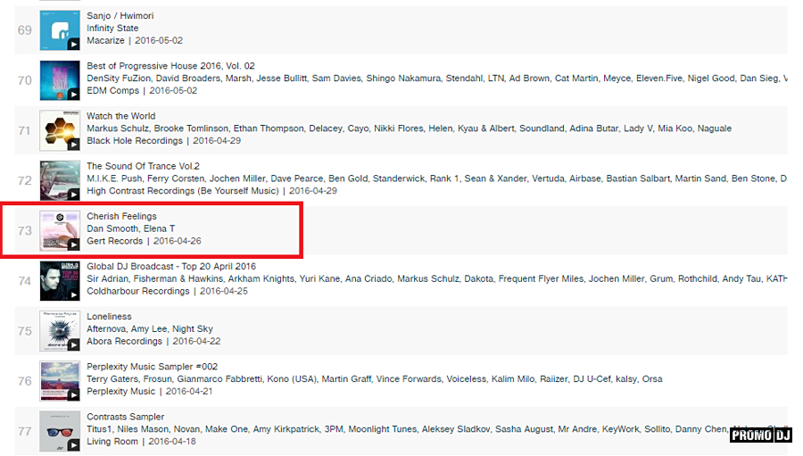 Релиз Dan Smooth, Elena T - Cherish Feelings попал в TRANCE TOP 100 RELEASES на beatport и занимает 73 место!
