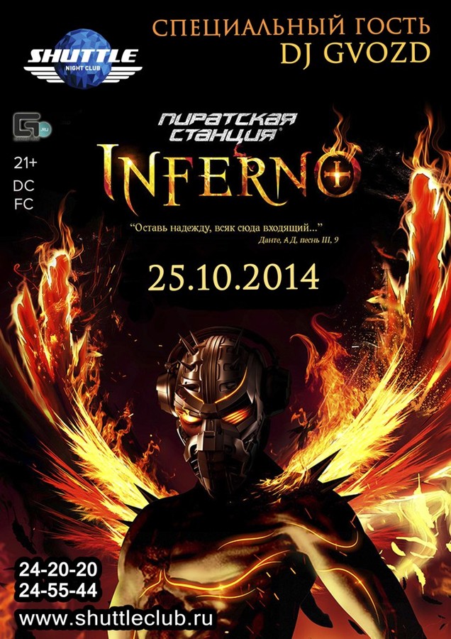 Pirate Station INFERNO «SHUTTLE» night club и Радио RECORD представляет премьеру новой, самой мистической, постановки крупнейшего электронного спектакля планеты Pirate Station INFERNO. Вас ожидает полное мистицизма путешествие в загробный мир через 9 кругов Ада и Чистилище ко вратам Эдема по мотивам средневековой "Божественной Комедии" Данте. Но войти в Эдем сможет только тот, кто не побоится заглянуть в глаза Люциферу. Шоу «INFERNO» – это спектакль нового уровня, потрясающая масштабами постановка, сочетающая в себе как фантастические воздушные номера прямо над головами зрителей, так и современные спецэффекты последнего поколения, вызывающие удивление и восторг. В эту ночь откроются врата в волшебный мир. Headliner: Dj GVOZD Виды билетов: Ангелы – танцпол. Архангелы – боковые балконы, возможность выхода на танцпол. Херувимы - сидячая трибуна на танцполе перед сценой. Ложи Эдема - диванная зона на втором этаже с лучшим видом на сцену. SHUTTLE - ЖИВИ НОЧЬЮ, НЕ СПИ! За Check-IN в Foursquare с 22.00 до 04.00 коктейль в подарок! «SHUTTLE» night club – ТВОЯ ТРАЕКТОРИЯ БЕЗУПРЕЧНОЙ МОДЫ! 24-20-20 www.shuttleclub.ru Line up: Dj Panarin (Discovery) Dj Well (Discovery) Dj Aleksander SancheS (Atlantis) Dj Misha Foma (Atlantis) ROmEO_MC (All club) Mr. Monrro (Mars) S|N|C GO-GO: Cosmo Dance Exclusive photo & video: www.shuttleclub.ru Services:  WI-FI  Cocktail SET  Кальян  FREE Cocktails for VIP Card  VIP – Ложе