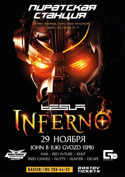 PIRATE STATION "INFERNO" 29 НОЯБРЯ РОСТОВ-НА-ДОНУ CLUB TESLA Крупнейший drum&bass спектакль планеты, покоривший своим шоу самую взыскательную публику, а фанатов d’n’b своим передовым звучанием и списком артистов. Пиратская Станция на протяжении многих лет слывет непревзойденным театрализованно-музыкальным действом и долгое время этот бренд был представлен исключительно в Москве и Санкт-Петербурге. В этом году Пиратская Станция представляет свою мистическую постановку INFERNO. Не устояла перед этим феноменом и Южная Столица. Пиратская станция с постановкой INFERNO посетит Ростов-на-Дону! Под сеты модных drum&bass артистов планеты и России в эту ночь вы совершите невероятное путешествие в загробный мир через 9 кругов Ада и Чистилище ко вратам Эдема по мотивам средневековой "Божественной Комедии" Данте. "Оставь надежду всяк сюда входящий" (Данте, "Ад", III, 9) РАДИО «РЕКОРД» В РОСТОВЕ ПРЕДСТАВЛЯЕТ: PIRATE STATION INFERNO 29 НОЯБРЯ TESLA JOHN B [UK] GVOZD [SPB RADIO RECORD] RED FUTURE [RADIO RECORD ROSTOV] NAIS [Краснодар] ESCAPE [Краснодар] HUNTER [Ставрополь] KEXIT FRED CHAVEZ NUTTY [BASSMAFIA] Ночной клуб "TESLA" (ул. М. Горького, 151), Телефон 207-25-27 В этом году Радио «Рекорд» в Ростове впервые представит расширенную версию культового фестиваля в Южной Столице.