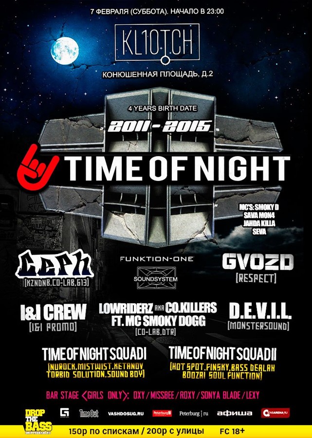 Внимание, андеграунд! Объявляем общий сбор по замечательному поводу - 4 года с момента рождения TIMEOFNIGHT!!! В планах ночи - большое количество интересных гостей, массовый 2-часовой b2b резидентов TON и нехилый дамский состав в барной зоне. Сопровождать все это будут, конечно же, мощные вайбы drum'n'bass & jungle саунда! Все DJ, MC, участники и гости наших событий, милости просим в субботу, 7 февраля, в уютный бар KL10TCH (Конюшенная пл.2) с отличнейшим рупорным звуком FUNKTION - ONE (марки, которая не нуждается в особом представлении). Начало в 23:00. ▼▼▼▼▼▼▼▼▼▼▼▼▼▼▼▼▼▼▼▼▼▼ Список по 150р: vk.com/topic-85307324_31098363 ▲▲▲▲▲▲▲▲▲▲▲▲▲▲▲▲▲▲▲▲▲▲ Специальные гости на событии: CEPH / (KZNDNB) [CO-LAB, G13] GVOZD / [RESPECT] D.E.V.I.L / [MONSTERSOUND] MAIN [D&B, JUNGLE]: LOWRIDERZ FT. MC SMOKY D I&I CREW TIMEOFNIGHT SQUAD 1: KETANOV NUROCK MISTWIST SOUNDBOY aka INFECTED TORBID SOLUTION TIMEOFNIGHT SQUAD 2: HOT SPOT SOUL FUNCTION BASS DEALAH FINSKY BOOZA! BAR STAGE [LIQUID FUNK, ATMOSPERIC FUNKY BREAKS,DUBSTEP]: OXY MISSBEE ROXY SONYA BLADE LEXY MC'S: SMOKY D SAVA MON4 JAHDA KILLA SEVA LUCKY7 Стоимость входа: 150р по спискам, 200р с улицы. Веб-сайт:vk.com/timeofnightz Местоположение:@ KL10TCH, Конюшенная площадь 2 Начало:7 февраля в 23:00 Окончание:8 февраля в 6:00