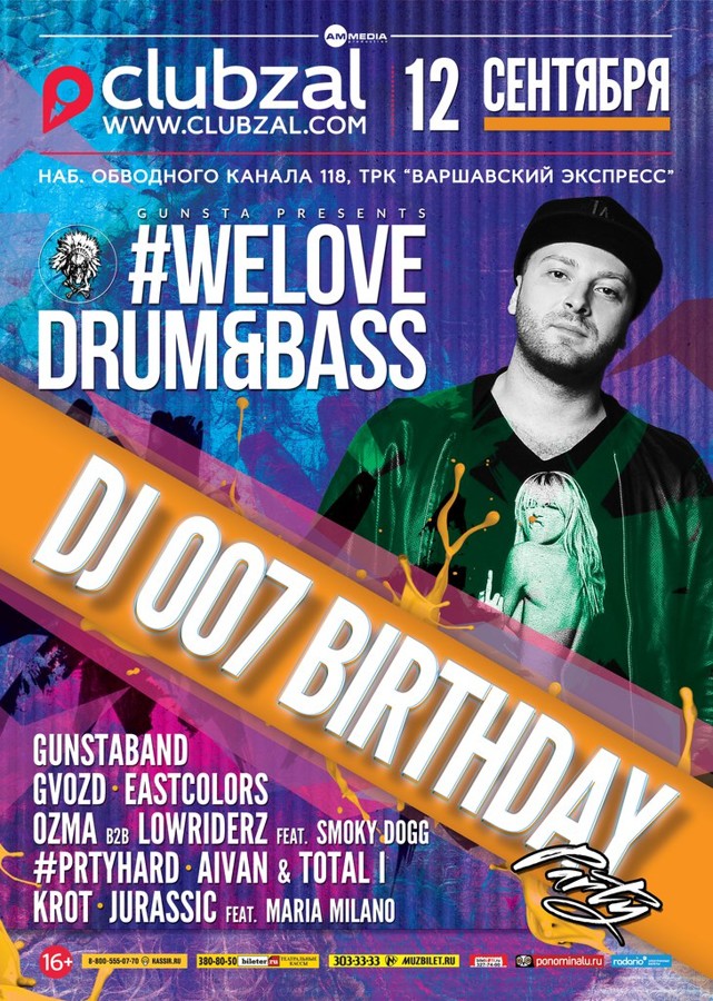 Ежегодные празднования Дня Рождения участников картеля GUNSTA уже стали доброй многолетней традицией, поэтому 12 сентября 2015 года мы приглашаем вас в клуб Зал Ожидания на фирменную вечеринку #WELOVE DRUM&BASS посвященную празднованию Дня Рождения DJ007 Именинника поздравят: GUNSTABAND (Toper&007) feat. MC DOSH GVOZD EASTCOLORS OZMA b2b LOWRIDERS feat. SMOKY DOGG #PRTYHARD AIVAN & TOTAL 1 KROT JURASSIC feat. MARIA MILANO И самое главное - это вы! Все те, кто поистине любит DRUM&BASS! Наш слоган, наша религия: More pressure, More Bass #WELOVE DRUM&BASS Адрес клуба: Наб. Обводного канала 118, ТРК «Варшавский Экспресс» Вход: STANDART - 200 руб. VIP - 500 руб. Заказ Билетов: 333-10-68