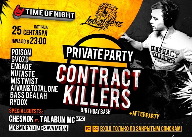 В пятницу, 25 сентября мы устроим праздник по случаю дня рождения одного из основателей успешных dnb-проектов LOWRIDERZ & CONTRACT KILLERS, а также боевой единицы команды TIMEOFNIGHT - Ромы Захарина! Для такого события мы нашли отличное место в самом сердце тусовочного Питера, а закрытый формат события поможет создать действительно дружескую атмосферу! Итак нас ждет: ♔ Звук - на уровне! ♔ Угар и дружеская атмосфера ♔ Правильный, питерский андеграунд! ♔ Afterparty до 9 утра ♔ Chillout-зона и чайная ♔ Френдли прайс в баре для друзей ♔ Зона, свободная для курения! Своими dj-сетами нас порадуют: CONTRACT KILLERS aka LOWRIDERZ with SPECIAL B-DAY SET! POISON / GVOZD / ENGAGE / NUTASTE / MISTWIST / BASS DEALAH / RYDOX/AIVAN & TOTAL ONE SPECIAL GUESTS: CHESNOK FT. TALABUN MC Под вокальным прикрытием MC SMOKY D, MC SAVA MO|N4 ВНИМАНИЕ! ВХОД НА МЕРОПРИЯТИЕ ТОЛЬКО ПО ЗАКРЫТЫМ СПИСКАМ!