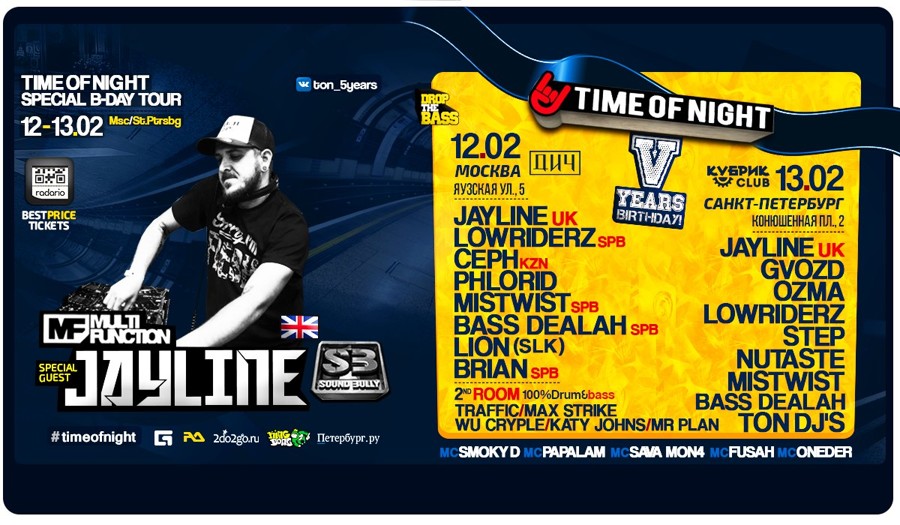 Масштабный праздник на два города по случаю 5-летия команды Timeofnight с участием специального гостя из Англии - JAYLINE!