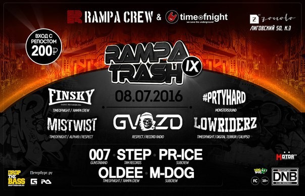 TIMEOFNIGHT & RAMPA CREW PRESENTS: RAMPA TRASH vol.9 8 июля, в пятницу серия Rampa Trash возвращается! Для вас всю ночь: отборный и качественный селект Drum-n-bass различных поджанров под контролем опытных мастеров, уютный и атмосферный Цоколь 2.0, кикер, лояльные цены в баре! Line Up: GVOZD (Respect / Record Radio) 007 (GUNSTABAND) LOWRIDERZ ((Digital Terror, Co-Lab) #PRTYHARD (DEVIL & EXTRA) FINSKY (TIMEOFNIGHT /RAMPACREW) STEP (Tam Records) MISTWIST (TIMEOFNIGHT) PR-ICE (SUBCREW) M.DOG (SUBCREW) OLDEE (TIMEOFNIGHT/RAMPACREW) MCs : SMOKY D ONEDER SAVA MON4 FREEDOM НАЧАЛО В 23:30! ═══════════════════════════ ➨ ВХОД 200Р С РЕПОСТОМ! 300Р БЕЗ РЕПОСТА! ═══════════════════════════ Адрес: Лиговский 50, корпус 3, Цоколь 2.0