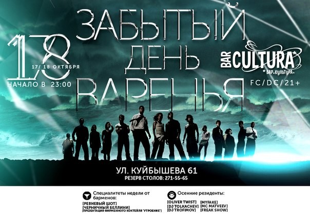 17 и 18 Октября - "Забытый День Варенья" Знаете как бывает, вроде живешь-живешь а про день рождения забыл... И что теперь делать? Надо его НАЙТИ и отметить в самой лучшей Культурной компании друзей. Для всех кто родился с 15 сентября по 18 октября получит у нас в баре скидку в 20% (предъявив свой паспорт). А свой день рождения мы потеряли 21го сентября((( Вот и будем его искать... Осенние резиденты: DJ Trofimov DJ Tolkachev Oliver Twist MyFake MC Matveev Специалитеты недели от барменов: - ревневый шот, - черничный беллини, - презентация фирменного коктейля "Утроение"