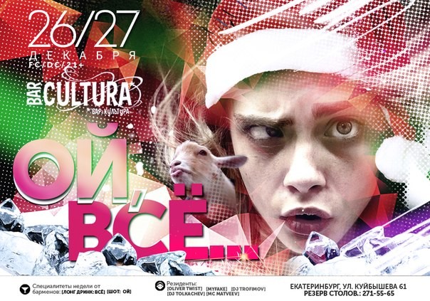 Обвал рубля, кризис, курсы валют, стоимость нефти, межбанковские кредиты, ликвидность... ОЙ, ВСЁ... Конец декабря - время успокоиться, завершить большие дела, подвести итоги... Мы все очень хорошо работали в этом году, правда ведь? Поэтому должны хорошо отдохнуть! И как к любому большому делу - к хорошему отдыху тоже надо готовиться... Чем мы и предлагаем заняться в ближайшие выходные... Вспоминаем самые громкие вечеринки уходящего года, собираем лучших друзей на большую репетицию новогодней ночи... Не всё: DJ Trofimov DJ Tolkachev Oliver Twist MyFake MC Matveev Специалитеты недели от барменов: - шот ОЙ - лонг дринк ВСЁ
