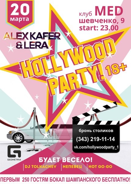 Это тематическое мероприятие с громким названием, которое покорит город и его жителей. Вас ожидает шоу программа, горячие go-go, холодный алкоголь, вкуснейшая еда, лучшие кальяны, музыка и атмосфера HOLLYWOOD PARTY. А так же розыгрыши призов от наших спонсоров. И кстати первым 250 гостям мы наливаем шампанское бесплатно. Мы создадим для вас атмосферу праздника. Ждём вас в гости веселых и красивых. Всем быть к 23:00, пришедшие позднее многое потеряют.