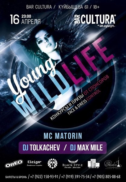 Ты задыхаешься от серых и тоскливых будней?! Тебе не хватает драйва и положительных эмоций?! Работа и учеба действует на нервы?! МЫ ЗНАЕМ,КАК ТЕБЕ ПОМОЧЬ! Это твоя возможность окунуться в атмосферу веселья и драйва! YOUNG WILD LIFE 18+ МЫ гарантируем тебе, что ТЫ не забудешь те эмоции, которые получишь в эту ночь! Атмосферу этой ночи для тебя будут создавать: - DJ TOLKACHEV & DJ Max Mile - MC Matorin