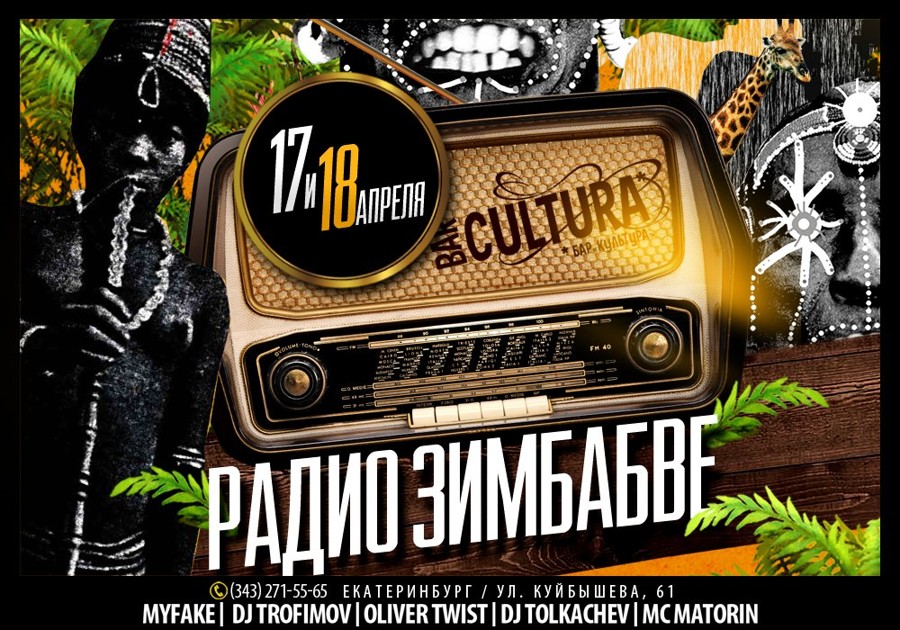 17 и 18 Апреля - "Радио Зимбабве" Если вы любите танцевать - то непременно в этот weekend вы должны прийти в Культуру и оторваться по полной, если вы не любите танцевать - в этот weekend вы непременно должны прийти в Культуру, выпивать и веселиться. Потому что у нас всегда найдётся повод! В этот weekend традиционно объединяем лучшие праздники в один веселый угар - день радиолюбителя мы совместим с днем независимости Зимбабве (той самой Зимбабве, что на реке Лимпопо)... Так что как всегда проведем выходные весело, ярко и пьяно! Или "тракошлакошннапллоах" - как говорят Зимбабцы)))) Резиденты: DJ Trofimov DJ Tolkachev Oliver Twist MC МАТОРИН