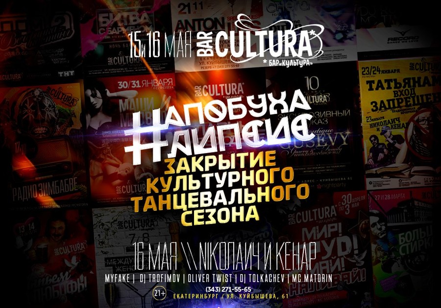 15 и 16 Мая - #АПОБУХАЛИПСИС Есть вечеринки, которые не забываются никогда! Вечеринки, в которых собрано всё самое яркое, лучшее и так сильно полюбившееся нашим гостям. Мы закрываем этот клубный сезон и хотим, чтобы вы ощутили каждой клеточкой весь водопад эмоций за этот год. Вспомнили, станцевали, спели, рассмеялись и влюбились еще раз вместе с нами. Скидываем тёплую одежду, открываем двери и окна: Привет, Лето - пора жарких open-air'ов с танцами под луной. Шоу должно продолжаться, и продолжим мы его вместе уже скоро на летней площадке Cultura лето. А пока собираем старых друзей, наливаем стаканы пополней и танцуем до упаду! Это будет настоящий #АПОБУХАЛИПСИС! Концентрат веселья, двойной удар счастья под дых, пляски до утра, ведро пунша на всех! Не сходи с ума, не жалей ни о чём! 16 Мая - Nickолаич&Kenar Резиденты: DJ Trofimov DJ Tolkachev DJ Alex Fadeev MC МАТОРИН