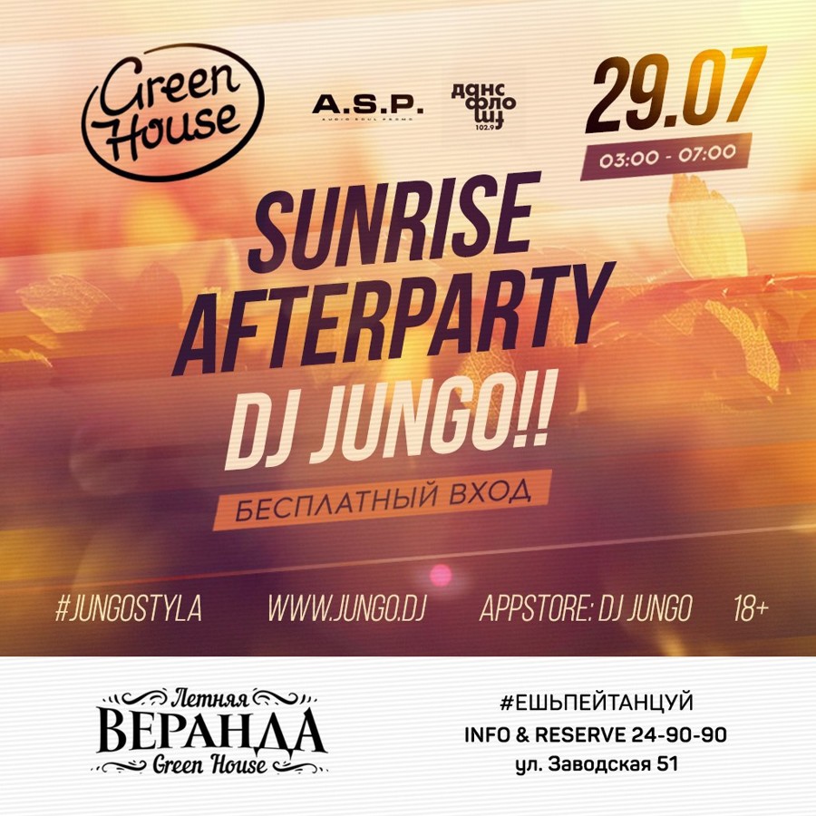 Алоха! Планы на этот weekend... Присоединяйся ко мне! 29.07: 21:00 – Fabrika, 03:00 – Green House. 30.07: 20:00 – Ялта, 01:30 – Chill’im, 03:00 – Green House. 31.07: 21:00 – Fabrika. DJ JUNGO!! #jungostyla www.jungo.dj