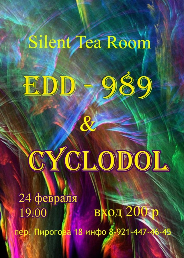 24 февраля ждем Вас в уютной чайной Salent Tea Room vk.com/sitea в Пт 19-00 до 23-00, для вас будут играть Chill out два замечательных проекта Cyclodol и EDD-989 . Основатель проекта "CYCLODOL" — Илья Шувалов музыкой интересовался с детства. Имеет музыкальное образование по классу фортепиано. Электронную музыку начал осваивать с 1999 года. Проект "CYCLODOL" был основан в 2007 году, его концепция заключается в абстрагировании от какого-либо музыкально направления,вся композиция строится на экспериментальном подходе написания трека. В процессе создания используются исключительно настоящие (не виртуальные)музыкальные инструменты (синтезаторы, семплеры, обработка). При написании трека применяются пошаговые секвенсоры без использования компьютерных программ. Проект EDD-989 - это музыкант Эдуард Коркин (Санкт-Петербург), в начале своих первых музыкальных опытов - делал звуковые сопровождения к стихотворениям Олега Григорьева и Даниила Хармса. Далее - эксперименты в стиле Dark ambient, а затем создание мелодичного IDM. На сегодняшний день стилистика проекта развивается по следующим направлениям Ambient, Psychill,Downtempo.