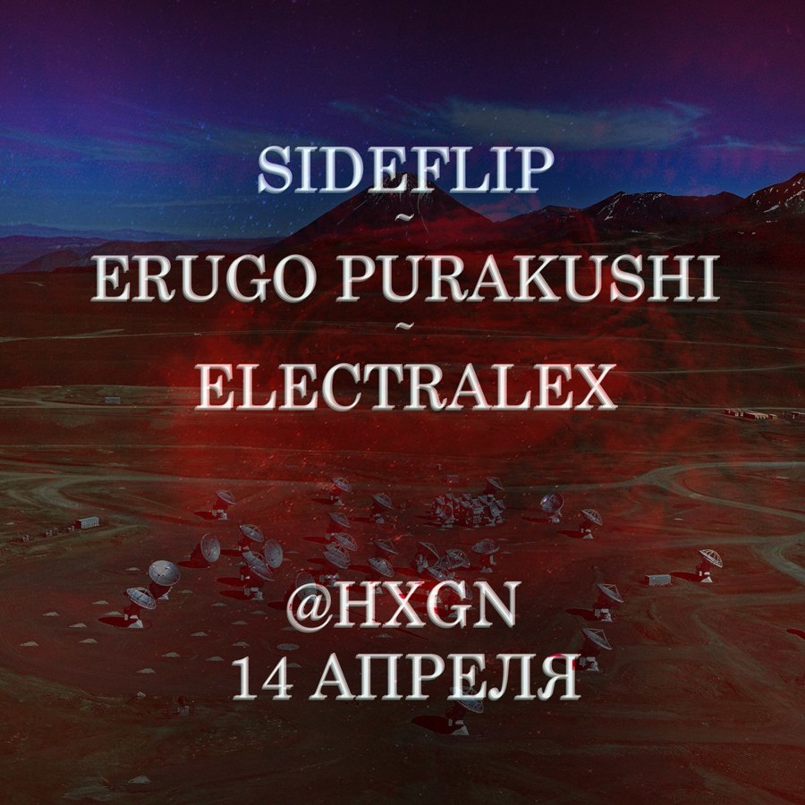 14 апреля HXGN впервые принимает эту троицу весьма разношёрстных гостей: SIDEFLIP - дуэт, пишущий электронную музыку в стиле breakbeat. Эти парни чтят корни электронной музыки и рейв-культуру начала 90-х. ERUGO PURAKUSHI - музыкант родом из Ленинграда, композитор и промоутер. Электронным направлением заинтересовался в 2010 году, и с тех пор безостановочно экспериментирует со звучанием и композицией. ELECTRALEX - питерский ди-джей, музыкант. Представитель лейбла Самбит рекордс, представитель Darian Planet production, член творческого объединения электронных музыкантов Fulldozer. Начало в 20:00, вход свободный.
