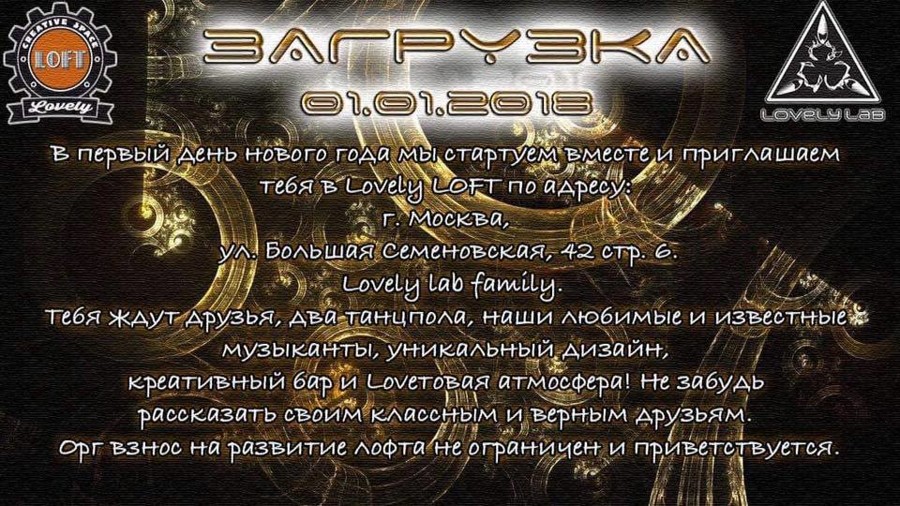 И так начнём ! Друзья и дорогие гости! мы ждём Вас всех в Лавли лофте с 1 на 2 обсудить Новый год, сформировать планы и просто побыть вместе в лучших традициях андеграундной транс сцены нашей столицы!) познакомиться тем кто ещё не знаком, увидеться со старыми друзьями, каждому найти своё счастье на некоммерческом привате услышать музыкальные шедевры друзей это то чего всем нам так не хватает в нашей обыденной жизни. В одну воду не возможно войти дважды, так что вэлкам!) в Кубе мы ждём качественный заряжающий позитивной энергией ночной дарк псай транс саунд, решение с оформлением пространства было найдено и это свет, зал лоундж заполнят полотна и естественно флюоресцентные лампы подсветят ваши глаза и зубы если хотите есть ещё студия это 3 танцпол над которым думаем в данный момент) Lovely lab promo при поддержке H2O promo и Satori Panic promo собирают Лайн ап который будет утверждён и подтверждён нашими звездными музыкантами чуть позже. Алексей Трансдрайвер и Алексей Солнце ждём вас! Не представляем транссцену без вашего участия!) Александр Вода, Артем Псарт, Артем Ti-Moon, Роман Perlos, Playback, Никита de'liques, Игорь Nostromosis, Анастасия alienstasia, Okean x и все думающие друзья) очень ждём!