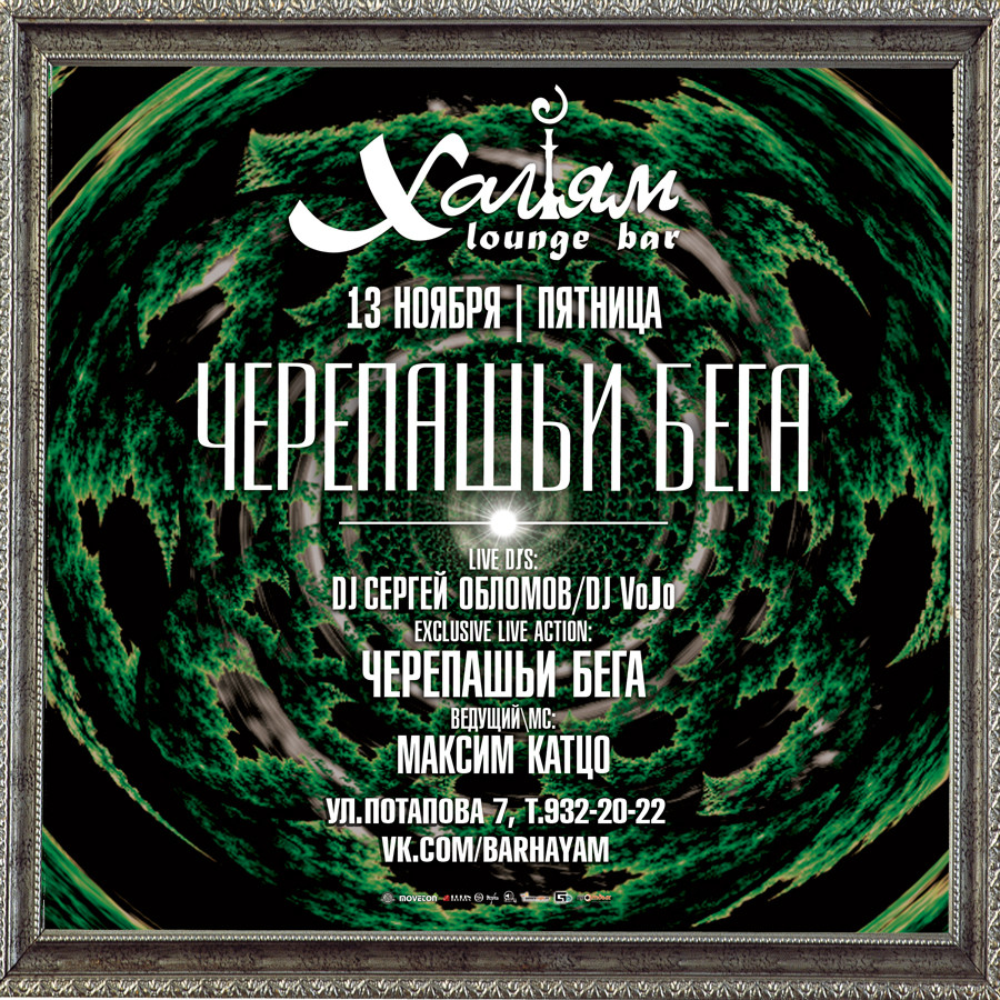 13 ноября | ЧЕРЕПАШЬИ БЕГА @ Bar "ХАЙЯМ" Бар ХАЙЯМ на Потапова 7 - спокойное место для приятных людей. Отдых разумом, душой и телом, атмосфера позитива - основные составляющие отличного вечера! А Пятница - самое время расслабляться в приятной компании своих друзей и знакомых на Потапова 7! В эту ночь состоятся настоящие черепашьи бега - эксклюзивные и ооочень будоражащие, такое пропускать не советуем Вновь порадуем уши и мозг отличной DEEP House музыкой, которую представят DJ СЕРГЕЙ ОБЛОМОВ promodj.com/oblomov и DJ VoJo, а живот порадуем вкуснейшей кухней и отменным баром, ведь Пятница отличный повод, чтобы провести романтический вечер с любимыми или встретиться со своими друзьями и подругами в уютном спокойном месте, с музыкой ласкающей слух и не отвлекающей от неспешных бесед. А также поднимать настроение и градус ночи будет искромётный ведущий МАКСИМ КАТЦО!! А умопомрачительный кальян лишь добавит свежих ноток в этот волшебный вечер! ДО ВСТРЕЧИ В ХАЙЯМ! Мы открыты с 12 утра до 6 утра ежедневно, а Музыкальный старт в 22:00, вход свободный всем! Резерв и инфо по телефону 932-20-22 vk.com/barhayam