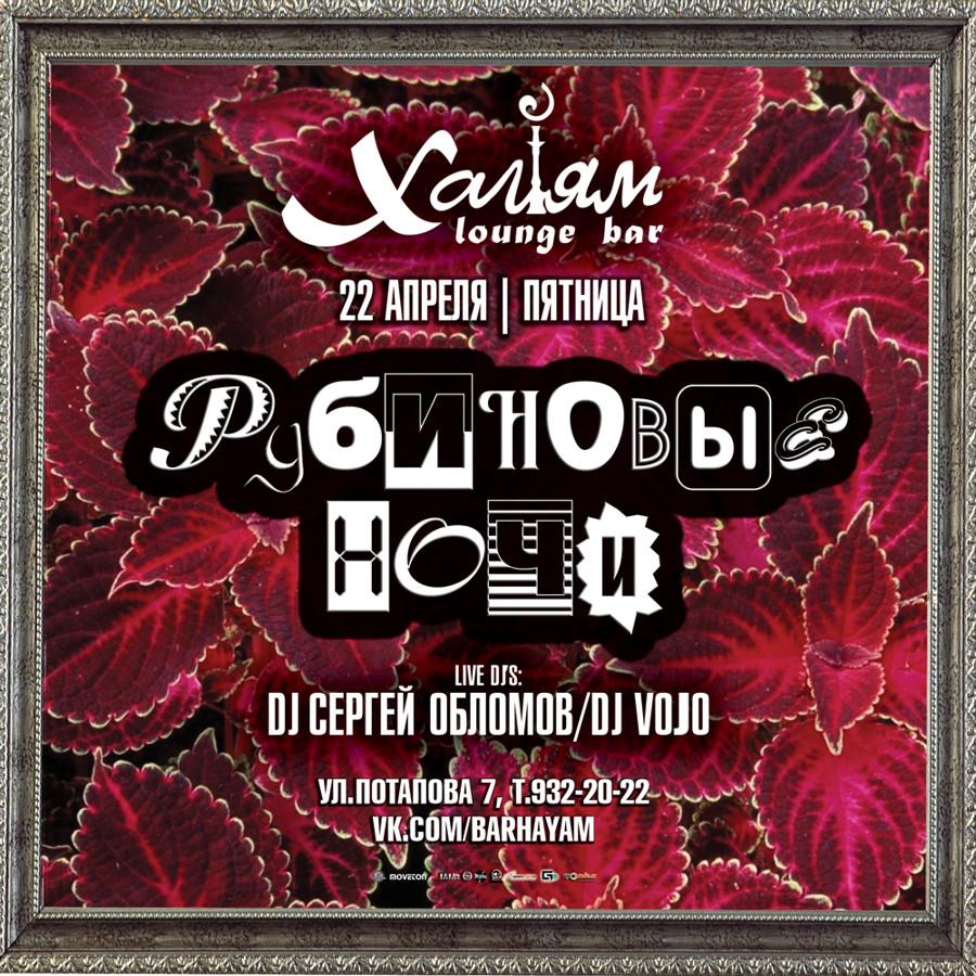 22 Апреля | РУБИНОВЫЕ НОЧИ @ Bar "ХАЙЯМ" Продолжение серии культовых вечеринок РУБИНОВЫЕ НОЧИ! Отдыхаем после жаркой трудовой недели, дружно, не спеша и в отличной компании под приятную музыку! Актуальный саунд только этой ночью! До встречи в Хайям на Потапова 7! Неподдельная атмосфера загадочного Востока и, как всегда, на позитиве и под отличную музыку до утра! Бар Хайям - это то что нужно в выходные дни для того чтобы зарядиться позитивной энергией на всю предстоящую неделю!! В эту субботу собираемся в Хайям на Потапова 7!! Свежая танцевальная музыка и тонны энергии, всё это сегодня Вам дарят - легендарный DJ СЕРГЕЙ ОБЛОМОВ (oblomov.pdj.com) и DJ VoJo! Такое событие пропустить никак нельзя! ВСЕ В ХАЙЯМ!! Мы открыты с 12 утра и до 6 утра ЕЖЕДНЕВНО, а Музыкальный старт в 22:00 (пт и сб), вход свободный всем! Резерв и инфо по телефону 932-20-22 vk.com/barhayam