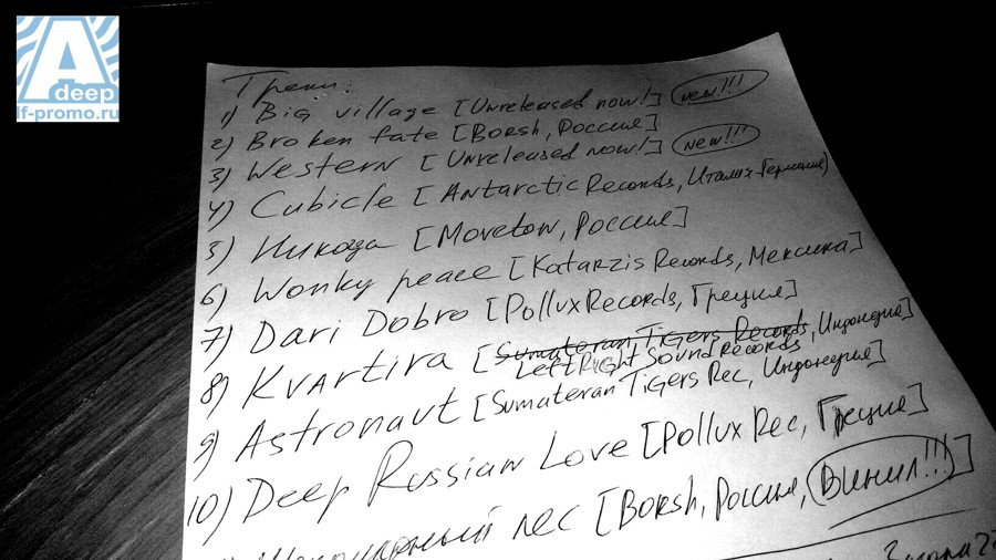 Guest: Таверна Фигаро (Samara), Независимый лейбл Sambit (Samara), Intrigue (Ufa), нк Гараж (Samara), Castle (Samara), RADIO TOP (Tula), UNDERGROUNDCLUB [EX TUNNEL] (Saint Petersburg), Point club, Санкт-Петербург, Литейный пр., 52 (Saint Petersburg), Стирка 40 градусов (Saint Petersburg), Ночной клуб «Звезда» (Samara), Формула 1 (Tolyatti), радио Мегаполис (Samara), Радио Максимум (Samara), радио 21 Век (Samara), радио Родное (Samara), радио Самара-Максимум (Samara), ГЭС ФЕСТ (Tolyatti), Snickers Urbania (Samara), Club Pasta (Samara), НК «Manhatttan», (Samara), Desperado (Samara), НК AcademClub (Samara), НК «City» (Samara), Арт-Клуб Бумажная Луна (Samara), The Real Cafe ГОЛОЛЁD (Samara), Малахит (Samara), кафе Комета (Samara), кафе Три тополя (Samara), Вася (Samara), ГОРЫНЫЧ (Samara)