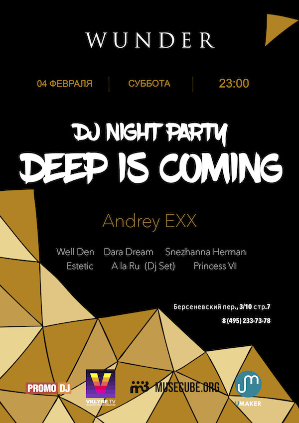 Семь артистов, семь полноценных лайвов, семь часов электронной музыки. Всё это состоится 4 февраля в Wunderbar. Для истинных любителей Deep/Tech House целую ночь будет звучать микс только из самых ярких треков. Удивительная атмосфера солнечной Ибицы и сгусток музыкальной энергии сделают эту ночь незабываемой: свободной от оков, стереотипов и предубеждений. LINE-UP: Snezhanna Herman, Estetic, A la Ru (Special DJ Set), Well Den, Dara Dream, Princess VI и хедлайнер Andrey EXX. Истинным поклонникам электронной музыки, не мыслящим своей жизни без танца – DEEP IS COMING! Адрес: г. Москва, Берсеневский переулок, 3/10 стр. 7 ВХОД СВОБОДНЫЙ!
