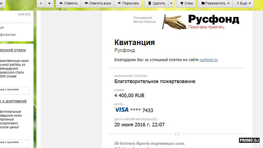 В итоге общими усилиями удалось собрать 3375 рублей, которые будут переданы в фонд благотворительной акции «День добрых дел» на Пятом телеканале. Полный отчет будет предоставлен, как только Промо переведет деньги на счет. Всем кто принял участие в этой акции или просто поддержал её, большое спасибо!